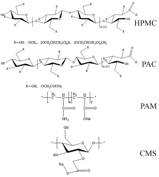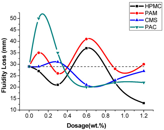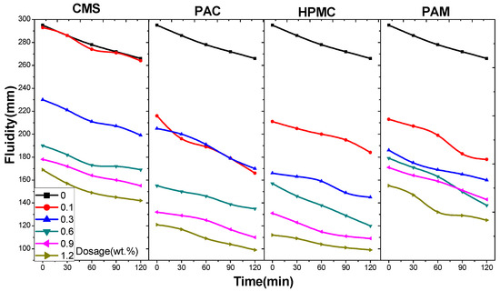 Fluidity and fluidity loss of cement paste with CMS, PAC, HPMC, and PAM.