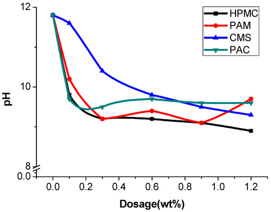 Considering the greater impact of coarse aggregate on the test results, the anti-washout resistance was tested with mortar. A 100 g sample of cement mortar was added to a beaker containing 300 mL of water. After 3 min of precipitation, most of the sediments sank to the bottom. The pH factor test has been proposed for determining the washout resistance of UWC in Japan [1]. However, the flocculating states significantly differ between AWAs alone and mortar without AWAs [38]. The interfaces between the supernatant and suspension were not obvious, and the concentrations of the suspensions also differed (Figure 3). Thus, separating the supernatant solution from the suspension is difficult, and this phenomenon leads to instability and inaccuracy in the pH factor test. Finally, the pH of the supernatant solution was measured, which was relatively clear [39]. The higher the pH is, the greater the washout. When the AWCA dosage increased, the pH of the supernatant solution decreased. Before a dose of 0.6% was reached, the test results indicated that the washout resistance was affected, in order of importance, by the dosage of HPMC, PAM, PAC, and CMS (Figure 4) [40].