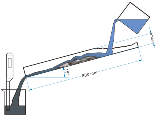The test procedure involved the use of a 70 mm long guttering channel set at a slope of 15° to the horizontal (Figure 5). A sample of cement mortar was placed 300 mm from the raised end of the channel, and 100 mL of water was poured into the pipe three times [42]. Then, the mass loss of the mortar was measured. In addition, the pH of the turbid liquid was measured as a control.