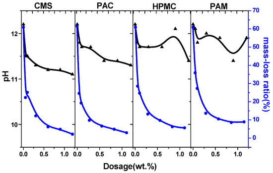 A comparison of the pH factor test and steam test results revealed that although they both had the same effect on the dosage of AWAs and had an anti-dispersion effect, the pH factor test was more unstable. In the horizontal comparison, the results of the steam test reflect the actual mass loss of the cement paste and more closely reflect the actual anti-dispersing ability of AWAs. The mass loss of paste with HPMC and PAM is greater than that with CMS and PAC. However, the results of the pH factor test are completely opposite to those of the steam test (Figure 5). The pH of the turbid liquids improved slightly but still deviated from the actual values.