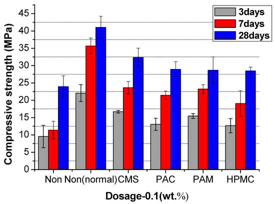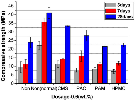 Figure 12, Figure 13 and Figure 14 show the compressive strength of the UWC with different dosages of AWAs. The Non and the Non (normal) are the controlled trials without AWAs, which are formed underwater, and the ordinary method, respectively. The early strength (3 days) of the UWC with AWAs is generally lower than that of those without AWAs (Figure 12, Figure 13 and Figure 14), but the later strength is greater. With increasing AWA dosage, the strength decreases because of the negative effect of AWAs on the early hydration of cement.
