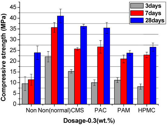 By comparing PAC and CMS, the additional hydroxyl groups of the cellulosic CMS enabled greater initial hydration retardation from hydrogen bonding. This imparts a higher workability retention. However, the dual hydroxyl and carboxyl functionalities also introduce the competing effects of pore structure disruption and delayed debonding [49]. Optimizing this balance between early particle association and longer-term matrix incorporation is necessary for strength enhancement.