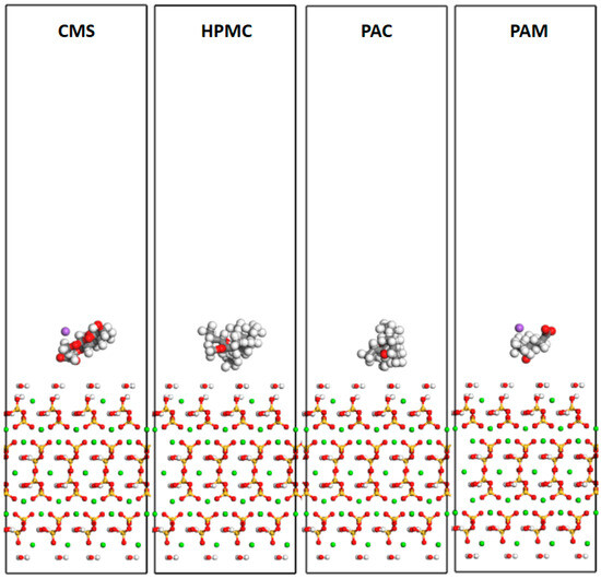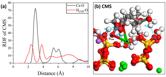 The adsorption interactions between four AWAs and the major cement hydration product C-S-H were studied using molecular dynamics simulation methods, and the effects of additive functional groups on adsorption interactions were explained through simulation. First, the radial distribution function (RDF) curves between the atoms/ions of different molecular systems and the C-S-H interface were calculated. As shown in Figure 17a [54], there are obvious characteristic peaks within 2.45 Å between the CMS molecules and the C-S-H interface; these peaks are attributed to the interactions between the oxygen atoms in the organic molecules and the hydrogen atoms in the hydroxyl groups on the C-S-H surface. The peak value indicates that hydrogen bonds can be formed between them. The characteristic peak at 4 Å indicates that there are indirect interactions between them. In addition, the calcium ions in the C-S-H substrate can also form ionic interactions with the oxygen atoms in the molecules. However, compared with the results of previous studies, the position of this peak was slightly more biased toward the right side of the coordinate axis. This shows that the ionic interactions do not occur within the process range. The local structure is displayed in Figure 17b.