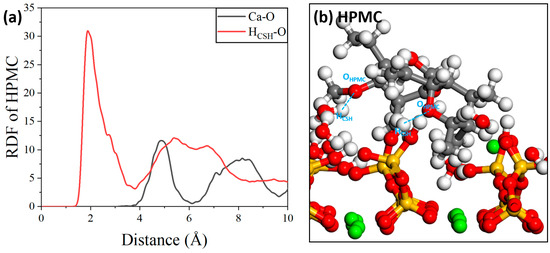 For the HPMC molecules, the peak corresponding to hydrogen bonding occurred at 2 Å, indicating that the hydrogen bonding interactions between the HPMC molecules and the C-S-H substrate were more pronounced. For the mutual interaction between calcium cations, the RDF curves in Figure 18a show that the RDF peak value of Ca-O is located at approximately 4.8 Å, which far exceeds the range of Ca-O ionic interactions [55]. There are almost no short-range interactions between them. Therefore, the main interaction between the HPMC molecules and the C-S-H substrate is dominated by hydrogen bonding, and the interaction diagram is shown in Figure 18b.