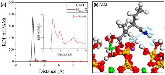 Finally, as shown in Figure 20, regarding the interaction between the PAM molecule and the C-S-H substrate, first, the oxygen atom in the PAM molecule can effectively form a Ca-O ionic interaction with the calcium ion in the C-S-H substrate. In addition, for the point interaction, there is an obvious peak within 2.4 Å, which is the hydrogen bonding range, indicating that there could also be hydrogen bonding interactions between them, and the shoulder peak near 4 Å shows that PAM molecules can effectively form close-range hydrogen bonds with the hydrogen atoms in the C-S-H substrate. The interactions between the PAM molecules and the C-S-H substrate are richer in form and stronger in intensity [57].