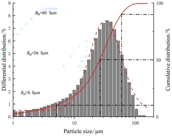The soil utilized in the experiment was Qinwangchuan loess, sourced from the artesian irrigation project site in Gansu Province. The soil samples exhibited a brownish-yellow color and were primarily composed of quartz, calcite, and albite, among other constituents. According to the soil mechanics test standard of China [], comprehensive assessments were conducted to determine the fundamental physical and mechanical properties of the soil sample. Consequently, essential physical parameters pertaining to the loess were obtained, as presented in Table 1. A laser particle size analyzer was employed for testing purposes, yielding a graphical representation of the particle size distribution within Figure 1.