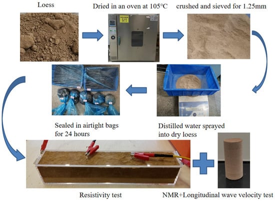 According to the geotechnical test specification, the loess was reshaped into 11 groups of samples based on the design moisture content, which are 5%, 7.5%, 10%, 12.5%, 15%, 17.5%, 20%, 22.5%, 25%, 27.5%, and 30%, respectively. The sample preparation process can be divided into five steps, as illustrated in Figure 2: (1) The collected loess is placed in a constant temperature drying oven at 105 °C for 24 h to evaporate the water. (2) The dried loess is crushed and sieved using a screen with a hole size of 1.25 mm. (3) An appropriate amount of pure water is uniformly sprayed onto the dried and sieved loess to achieve the desired moisture content. (4) The moistened loess is sealed in a plastic bag and placed in a drying dish for 48 h to ensure uniform moisture distribution. (5) By controlling the dry density within the range of undisturbed soil (1.55–1.62 g/cm3), the required loess sample with a dry density of 1.55 g/cm3 is prepared. A cylindrical specimen with a diameter of 39.1 mm and a height of 80 mm is prepared using the static pressure method for NMR and acoustic wave tests. In the resistivity test, a sample with a density of 1.55 g/cm3 is prepared using the layered compaction method. Three soil samples are prepared for each moisture content group, resulting in a total of 33 soil samples. Tests are conducted successively, and the average value of test results is taken for each group of samples.