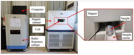 NMR is employed to acquire information about the fluid containing H nuclei in the sample through interaction with an external magnetic field. NMR tests on soil samples with varying moisture content were conducted using the MesoMR23-060H NMR analyzer manufactured by Suzhou Niumai Technology Co., Ltd. (Suzhou, China) The instrumentation and testing process are illustrated in Figure 3.