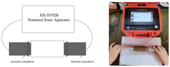 The HX-SY02B non-metallic acoustic meter, manufactured by Hunan Aocheng Technology Co., Ltd. (Changsha, China), was utilized to measure the sound velocity at three distinct positions of each specimen using the acoustic time rod test method and Vaseline as a coupling agent. During the test, two ultrasonic P-wave transducers (transmitting and receiving probes) were positioned at both ends of the circular section of the sample, as illustrated in Figure 4. The transmitting probe emitted a pulse wave that propagated through the soil sample and was subsequently received by the receiving probe at the opposite end.