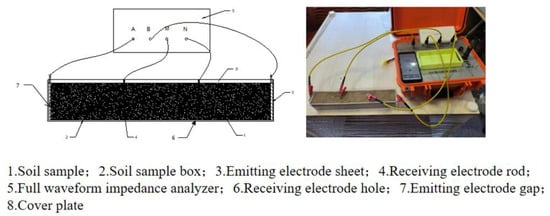 The resistivity was tested using the four-phase electrode method, with the full waveform impedance analyzer independently developed by Central South University. The size of the test box was 30 cm × 5 cm × 5 cm (length × width × height), constructed from a transparently insulated hard acrylic plate. The transmitting electrode plate (3) consisted of a silver sheet, while the receiving electrode rod (4) was made of silver (refer to Figure 5).
