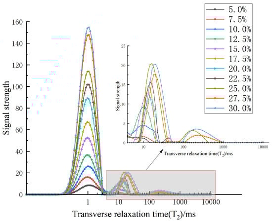 With the increase in moisture content, the signal amplitude of the three spectral peaks gradually increases, especially the main peak, which exhibits a significant enhancement. This observation suggests that as moisture content rises, it infiltrates into smaller-sized pores, leading to signal amplification and increased amplitude. Furthermore, there is a noticeable rightward shift in the second wave peak accompanied by an increase in both peak height and spectral area. These findings indicate that with increasing moisture content, water molecules penetrate deeper into the soil matrix, causing continued expansion of the pore radius and a tendency to enter medium-sized pores.