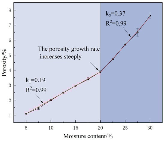 The NMR porosity changes of soil samples with varying moisture content are depicted in Figure 7. It is evident that with the increase in moisture content, the porosity of soil samples generally shows an increasing trend. When the mass moisture content is less than 20%, the water porosity demonstrates a linear increase with respect to mass moisture content. However, beyond this threshold, while pore moisture content continues to increase linearly with mass moisture content, there is a significant change in the rate of increase, indicating alterations in the internal structure of the soil. When the coherent density loess samples are prepared by the compaction method, the moisture content is different, the law of compaction energy transfer is different, and the stress path and compaction energy are different, which causes differences in the pore ratio of the samples.
