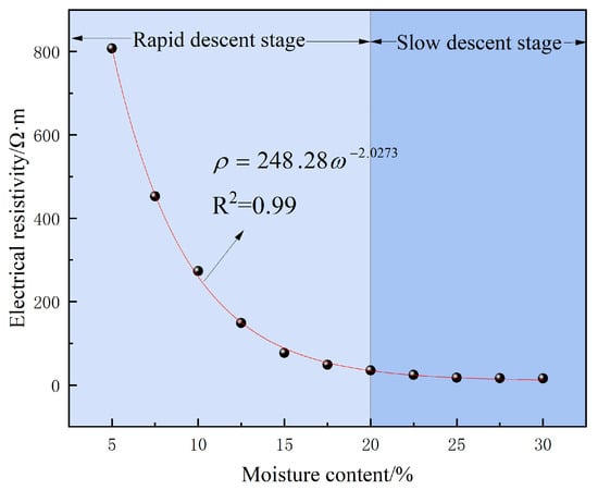 Stage 1: Rapid descent stage. When the moisture content increases from 5% to 20%, the resistivity of soil samples decreases rapidly. This is because when the soil moisture content is low, the solid particles in the soil are not easily compressed and compacted, the soil saturation is low, and there is a certain amount of gas in the pores, while the current is mainly conducted through the solid particle skeleton in dry soil or low moisture content soil, which leads to high resistivity of the soil. With the increase in moisture content, water enters the gaps between solid particles in the soil, air in the soil is squeezed out, and current begins to conduct through the connected pore water. The resistivity of tap water is about 12.5–200 Ω·m [], which is much smaller than that of solid particles, thus causing the resistivity to decrease rapidly with the increase in moisture content in the soil.