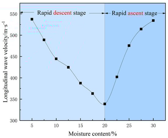 Stage 1: Rapid descent stage. As the moisture content of the sample increases from 5% to 20%, there is a significant decrease in longitudinal wave velocity accompanied by a pronounced change rate in the curve.