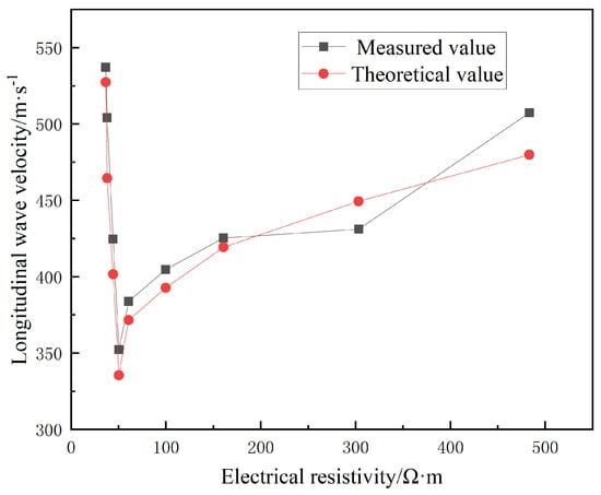 In order to validate the universality of the revised formula proposed in this paper, an additional set of loess samples was collected to test resistivity and wave velocity at different moisture content levels under identical dry density conditions. Simultaneously, the wave velocity values were computed using Equations (20) and (21). The comparison between the calculated results and experimental data is presented in Figure 12, demonstrating a consistent agreement between them.