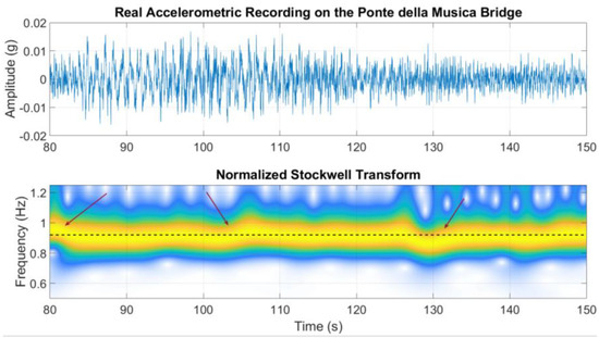 Example of fundamental frequency variations evaluated with the Stockwell transform on an accelerometer recording (vertical component) acquired on the “Ponte della Musica—Armando Trovajoli” bridge.