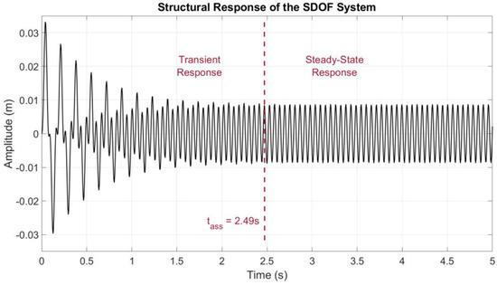 The concept of settling time is particularly important for understanding where the combination of input and forcing is such that it cannot be discriminated when acquisitions are made on a real system where the forcing is not perfectly known in all its components, i.e., always. In fact, whether it is a building or a bridge, the forcing is never perfectly known and can never be acquired. Consider the impact of wind or vibrations caused by internal forces within the system, such as vehicles passing over a bridge or vibrations caused by occupants inside a building. Therefore, there will almost always be some input of unknown origin that will generate a system response similar to that shown in Figure 1, where the transition from non-stationary to stationary could be mistaken for a modest frequency change. The situation may be further complicated by the fact that monitored systems are often subject to even slight variations in mass, stiffness, and damping. However, for low input values, they can cause fluctuations in the dynamic parameters of the system such that they lead to uncertainties in the estimation of eigenfrequencies and, consequently, in the definition of alarm thresholds. To this end, Equation (4) was defined in this paper to describe, in general, the considered SDOF system, in which the uncertainty parameters on mass estimation, damping, and stiffness were considered.