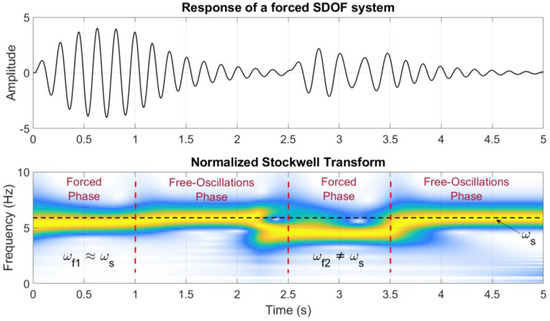 The same risk arises when the forcing stops, and the system undergoes another transient phase before returning to free oscillations. On a perfectly elastic system, apparent variations in frequency can be continuously generated. However, this occurs only at the particular combination of input and response during the transition from the transient phase to the stationary phase and vice versa. This mechanism repeats itself an unlimited number of times during the life of a structure and does not create any structural problems [35]. However, it can cause confusion in the interpretation of vibrational data (an example is depicted in Figure 3) where the effect of the phenomenon is extremized.