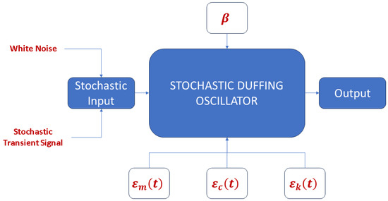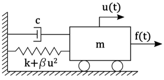 where can be considered as the coefficient of cubic stiffness of the SDOF system. This kind of equation has been widely used to analyse the chaotic behaviour of oscillating systems exciting both from stationary and stochastic input motion [37,38,39]. Graphically, the SDOF system of Equation (3) can be represented with the scheme depicted in Figure 4.