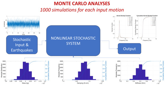 where m, c, k, and are constants, while , , and are random variables characterizing small disturbances, and f represents the external excitation. As discussed earlier, since it is not possible to solve Equation (4) analytically, it was necessary to write a MATLAB® [40] code (validated using the case histories for which the theoretical solution is available) to solve the nonlinear equation of motion and to perform Monte Carlo simulations [41,42].