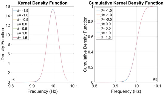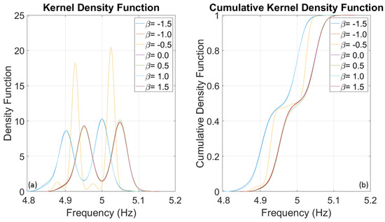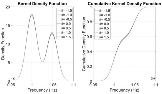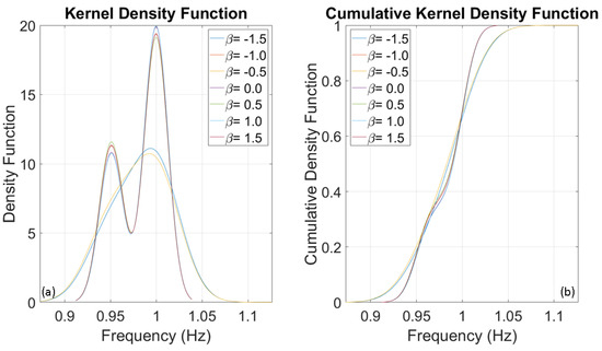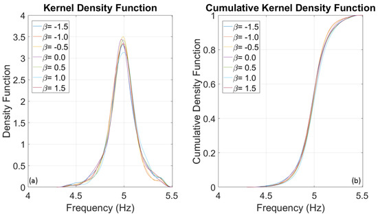 To evaluate the frequencies of three SDOF systems with fundamental frequencies of 1, 5, and 10 Hz, several thousand numerical simulations were conducted using stochastic input motions. The number of simulations for each oscillator was adjusted until the outcomes reached a stable state, identified at 1000 simulations. The probability distributions of the evaluated frequencies for the three oscillators are presented below. Upon analysing Figure 8, Figure 9 and Figure 10, it is clear that the dispersion of the results increases as the fundamental frequency of the analysed oscillator increases. The dispersion of the estimated frequencies appears to be minimally dependent on Duffing’s beta parameter. However, in some cases, the shape of the distribution is noticeably influenced by it. In this oscillation regime, the beta parameter acts as a disturbance on the structural response in terms of amplitude and waveform, but not in terms of frequency variation. This disturbance is similar to those caused by interactions between structural and non-structural components, constraints, friction, and other factors.