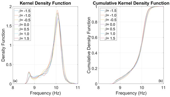 This section analyses the results of the Monte Carlo simulation using the selected earthquakes described in Section 3. Figure 12, Figure 13 and Figure 14 depict the Kernel Density Functions and Cumulative Distribution Functions related to the estimated fundamental frequencies of 1, 5, and 10 Hz SDOF systems.