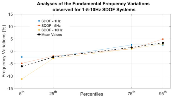 Robust estimators were used to define thresholds for the 1 Hz and 10 Hz Single-Degree-of-Freedom (SDOF) systems due to their non-normal statistical distribution. This required evaluating median and percentile parameters. Figure 11 shows the frequency variations for each SDOF system associated with the 5th, 25th, 75th, and 95th percentiles. It is important to note that the results were parameterized based solely on the fundamental frequency of the SDOF, treating all variable parameters as noise. The curve representing the median value calculated for each percentile is also included, providing a comprehensive visualization of the frequency variation across the different percentiles.