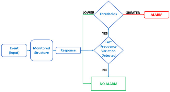 Simplified scheme related to the introduction of thresholds to minimize false alarms within the algorithm of an SHM system based on eigenfrequencies variations.