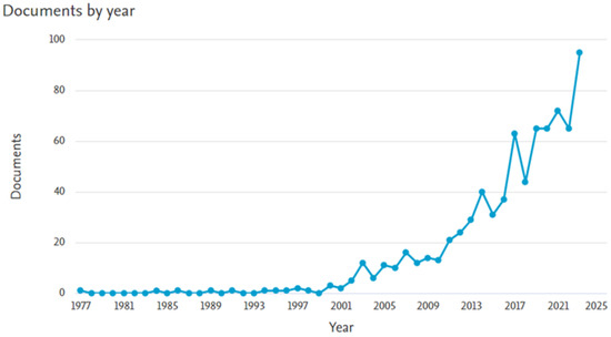 To address existing research gaps and advance the understanding in this field, a systematic literature review was conducted using the Scopus database, complemented by bibliometric analysis using the VOSviewer 1.6.20 software. The search strategy encompassed a broad yet targeted spectrum of the relevant literature, focusing on the intersection of landscape design elements and building energy consumption across various contexts. The resulting analysis revealed a substantial increase in research activity over recent decades (Figure 1), with a pronounced scholarly focus on sustainable urban design and energy-efficient building practices [59,60].