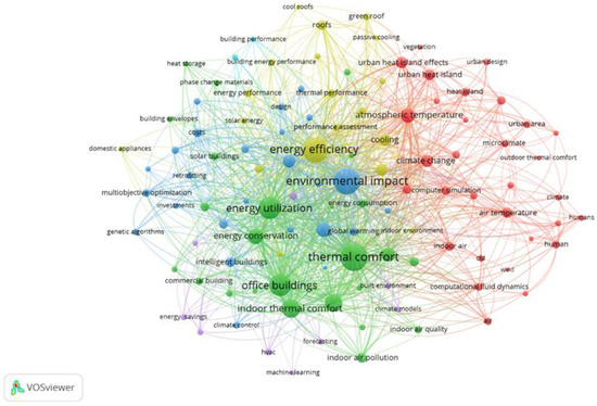 Bibliometric network visualization of key research themes related to sustainable urban design and building performance.