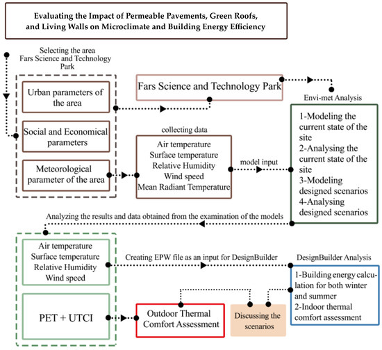 The Envi-met output (air temperature, relative humidity, and wind speed) of the reference case and scenarios was used as inputs for the DesingBuilder 7.0.2 model. These data were used to create an EPW file (EnergyPlus weather). Each EPW file was applied to the DesignBuilder model to calculate energy savings and indoor thermal comfort for each scenario through air temperature and humidity fluctuations. Figure 3 visually represents the methodological framework, briefly outlining the sequential steps involved in the research process. This flowchart serves as a guiding reference, facilitating a clear understanding of the study’s methodological approach and ensuring transparency and reproducibility in the research methodology.