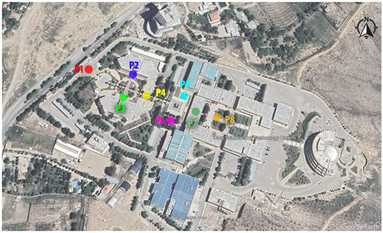 Figure 4 and Figure 5 clearly illustrate the areas designated for collecting meteorological information and installing data loggers. The unique topographical features of the location, particularly the rocky terrain, significantly influenced the strategic selection of the best points. Table 1 provides a complete analysis of each specified point, clearly explaining the reasons behind their selection.