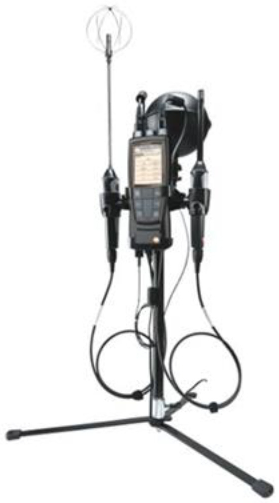 A device known as the Testo 480 was utilized to gather meteorological data from the field. It has the ability to measure, save, and analyze all the data pertaining to air conditioning, like airflow, temperature, humidity, pressure, degree of turbulence, heat radiation, CO2, illumination intensity, and PMV/PPD. Testo was founded in the Black Forest, Southern Germany, in 1957. The Testo 480 model, utilized in data collecting for this research, can connect and run many data loggers simultaneously. This enabled us to gather and store the information that was required concurrently. This device was used to measure and record a variety of factors throughout this research, including the temperature, humidity, wind speed, and amount of carbon dioxide present. Additionally, it was used to monitor and record these variables at each sampling point. Figure 6 and Figure 7 show the data loggers used to collect weather data.