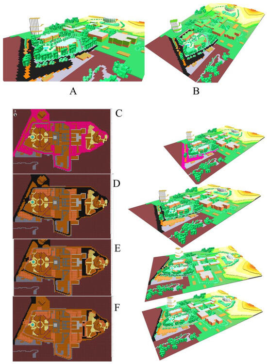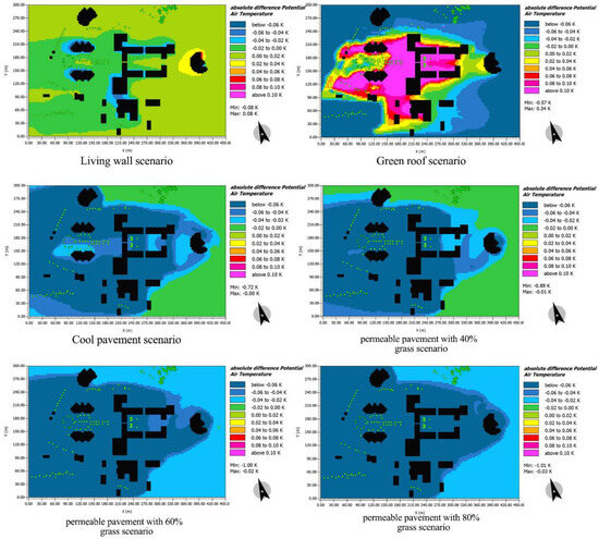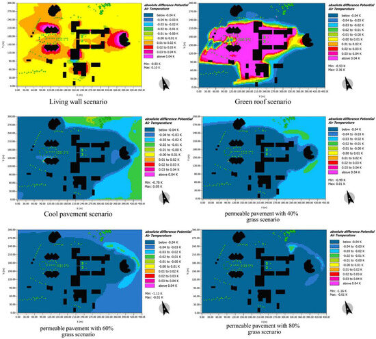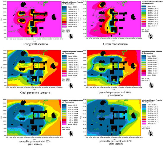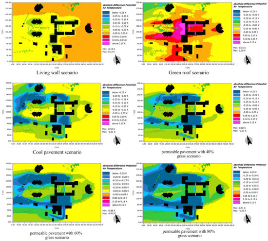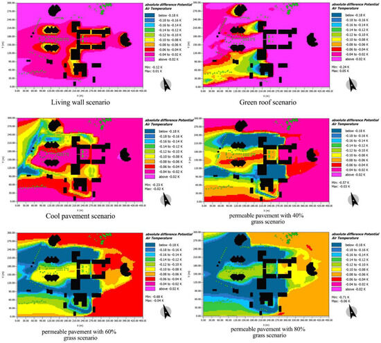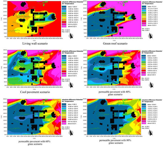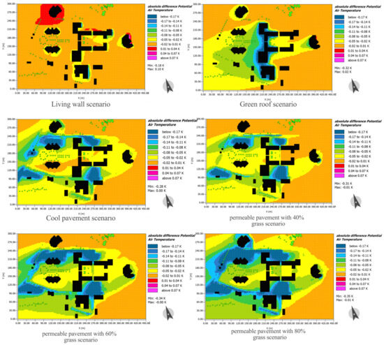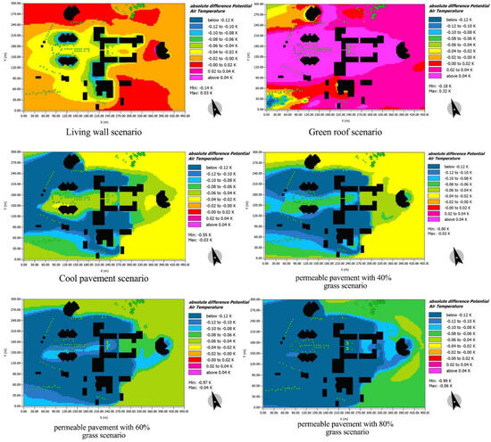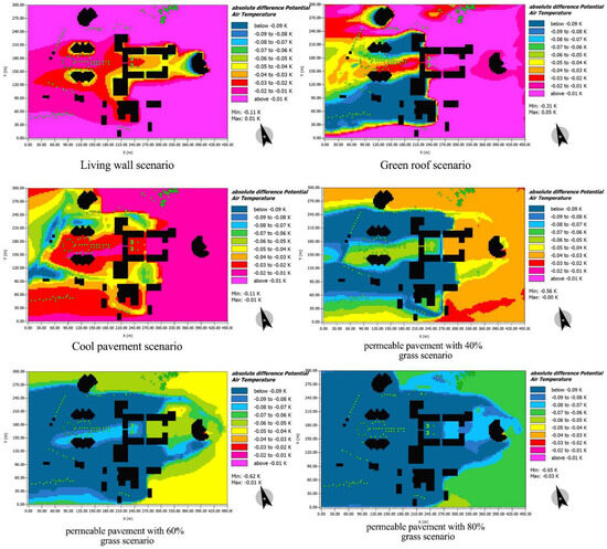 Modeling the reference case and each scenario in ENVI-met 5.1.1 software. (A) Applying a living wall, (B) applying a green roof, (C) cool pavement, (D) 40% permeable pavement, (E) 60% permeable pavement, and (F) 80% permeable pavement.