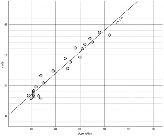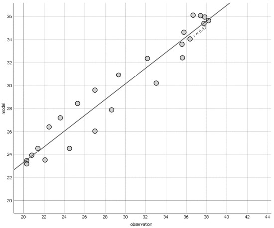 Figure 9 and Figure 10 compare the air temperature and relative humidity curves identified via the Envi-met simulation and the measured data. It is evident from the figures that there was a remarkable alignment between the simulated and measured values. Specifically, the relative humidity demonstrated a coefficient of determination (R2) of 0.93, while the air temperature exhibited an R2 of 0.94. These coefficients closely correspond with those reported in previous studies, typically ranging from 0.89 to 0.99, indicating high consistency and reliability in the findings [55]. Additionally, in Figure 9 and Figure 10, the air temperature and relative humidity exhibit RMSEs of 5% and 2.3, respectively. In their review, Tsoka et al. stated that the temperature’s RMSE should be below 4.30 °C, and the relative humidity’s RMSE should be under 10.2% [63,64]. As a result, the model is considered credible and reliable.