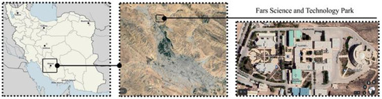 This study was conducted at Fars Science and Technology Park, located in Shiraz City, Iran. Shiraz is a city in south Iran known for its rich history, culture, and beautiful gardens. Over the last few decades, the City of Shiraz has undergone significant population growth, driven by factors such as rural-to-urban migration, the construction of industrial estates, and work environments on the city’s outskirts. This growth has resulted in the city’s physical expansion and changes in urban land use, with green spaces being replaced with infrastructure such as buildings, streets, and roads. As a result, urban heat islands have become more pronounced in Shiraz. The selected site is situated in a low-density urban region with sparse vegetation consisting mostly of plantain trees and bare soil devoid of grass. Furthermore, this location is situated in an area with a rugged topography. Figure 11 shows the location of Fars Science and Technology Park.