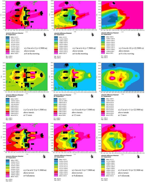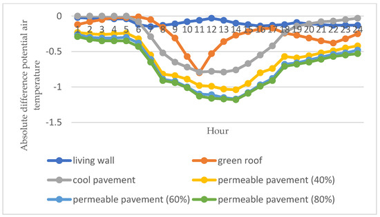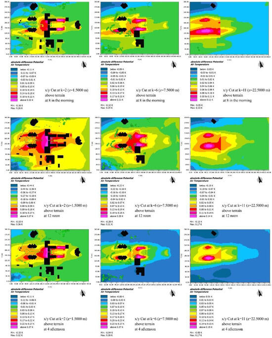These studies also showed that vegetation can have a moderate cooling effect on air temperature and energy consumption in intensively built-up regions, resulting in nominal decreases of 0.1 K and 0.2% for temperature and energy, respectively [31,32]. In other words, vegetation can have a cooling influence on air temperature and energy demand.