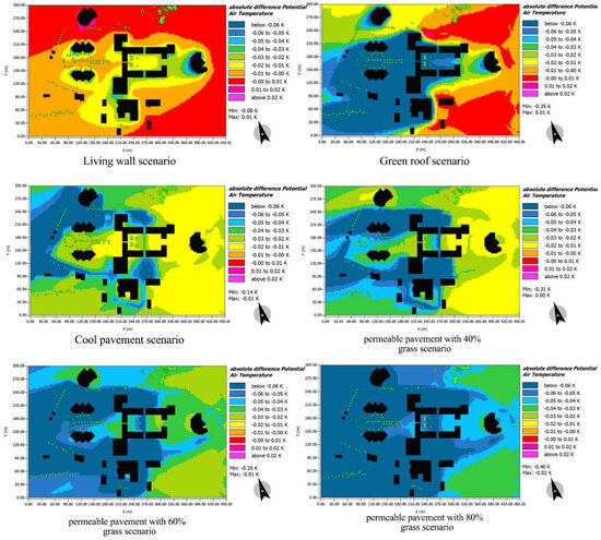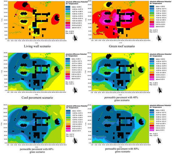 The findings underscore the significant influence of urban greenery and specific materials on mitigating temperature differentials, thereby enhancing indoor thermal comfort. Particularly in the summer, the permeable pavement scenario with 80% grass emerged as a potent solution, while the green wall showcased its effectiveness in the winter, especially in the north and northeast directions.