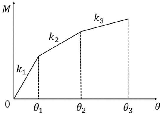 Disc buckle-type steel pipe brackets are formed by connecting horizontal and inclined rods to a disc buckle using rod end joints. Wedge-shaped pins and riser disc connections are used to form an invariant structural geometry system. As shown in Figure 2, the special connection mode between the ledger and the standard of the disc buckle steel pipe bracket results in the stiffness of the connecting joints between the articulated and rigid joints. The wedging depth between the wedge pin and the standard disc determines the stiffness of the joint. In actual construction, workers’ non-standard construction will lead to obvious differences in the stiffness of semi-rigid joints. In the design and calculation of the support, the rotational stiffness of the semi-rigid joint of the disc buckle steel pipe support is taken as , according to the technical code for temporary support structures in construction (JGJ 300-2013) []. In order to analyze how the tightness of latch wedges affects the rotational stiffness of disc buckle joints, a three-fold model of scaffold semi-rigid joints was proposed by literature []. The model, illustrated in Figure 3, includes different wedge-tightness scenarios and the corresponding values of each section are presented in Table 1. Wedge tightness is calculated by Equation (1).