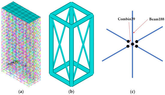 In this paper, the super high support system of the main body of a large commercial building is selected as the research object. As shown in Figure 4, the support system adopts a disc buckle steel pipe support. The overall size is , the distance on the x-axis is , the distance on the y-axis is , and the lift height is . The red box in Figure 4c shows the position of the top frame beam of the high support die, and the bottom of the beam is the encryption area of the support standard, with a spacing of . The anchoring is arranged at the height of ,,, and to strengthen the lateral stiffness of the support. According to the technical standard for the safety of disc lock steel tubular in construction (JGJ 231-2021) [], a support system with a height of more than 24 m needs to be specially designed and checked.