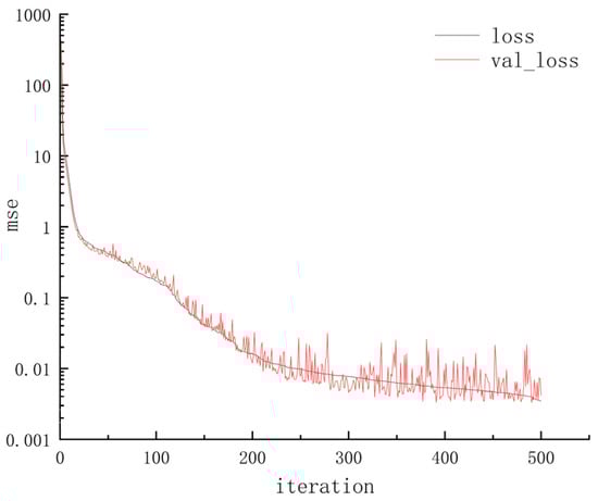 The loss function of the DNN surrogate model is “mse”, and its expression is shown in Equation (2). The optimizer uses “Adam”. The learning rate was 0.001. The nonlinear function is a Relu function. We wrote DNN models in python and used the built-in functions of the “keras” library to build a DNN surrogate model. The results of the training set and test set loss function are shown in Figure 7. In Figure 7, the blue line is the training set loss curve, and the red line is the validation set loss curve. The results of the loss function of the training set and the verification set become smaller rapidly, and the results of the loss function stabilize after 100 iterations. The model with 500 iterations is used for prediction. The comparison between the prediction results of the DNN surrogate model and the calculated values of the support buckling characteristics is shown in Figure 8. The gray band is the 2% relative error band, and the red line is the 1% relative error line in Figure 8. Most of the prediction results of the DNN surrogate model are within a 1% error band, and the rest of the data points are also distributed within a 2% error band.