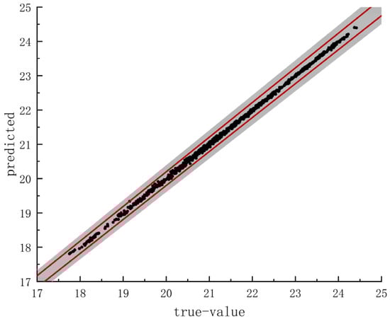 Model prediction results. (The gray band is the 2% relative error band. The red line is the 1% relative error line.)