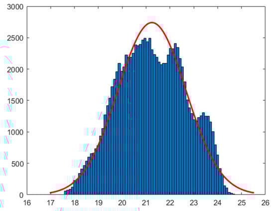 Randomly generated input samples of 100,000 sets of uncertainty factors were computed using the trained DNN buckling characteristic value surrogate model. The distribution of prediction results of scaffold buckling eigenvalues is shown in Figure 9. Under the influence of six uncertain factors, the brace buckling characteristic value will vary between 17 and 25, with a mean of 21.245 and a standard deviation of 1.9832. When the prediction results are fitted with a normal distribution, the mean and standard deviation are 21.2453 and 1.4262 (shown by the red line in Figure 9). The graphic results show that even under the influence of uncertain factors, the buckling characteristic value of the disc buckle steel pipe support system is still significantly greater than the stability requirements of the temporary rod support system in the project (the buckling characteristic value is greater than 4 []), which meets the safety requirements.