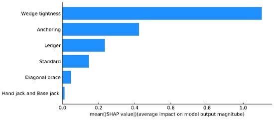 There are six different values for anchoring, but the SHAP value of the feature “Anchoring” is not scattered in six places. Instead, it is only clustered in three places. By examining the value of the specific sample, we can see that the SHAP point set on the leftmost part of the anchoring corresponds to the missing anchoring on the first floor (5.93 m), and the second SHAP point set on the left corresponds to the missing anchoring on the fifth floor (27.93 m). The SHAP values of these two-point sets are lower than the average contribution of the total anchoring, which means that the absence of the first or fifth anchoring significantly reduces the stability of the bracket. It appears that the SHAP values for the absent anchoring at other positions are comparable, suggesting that the missing wall parts at those positions have little impact on the bracket’s buckling characteristic value. This is similar to the performance under normal working conditions without any missing wall parts. As can be seen from the buckling mode of the bracket shown in Figure 6, the first layer wall connection is in the buckling position, and the fifth layer wall connection is at the bottom of the “free end” of the bracket. The buckling characteristic value of the support is most sensitive to the missing of these two walls connecting parts. Therefore, in the construction process, construction supervisors should focus on checking the wall connecting parts in the buckling position of the support.
