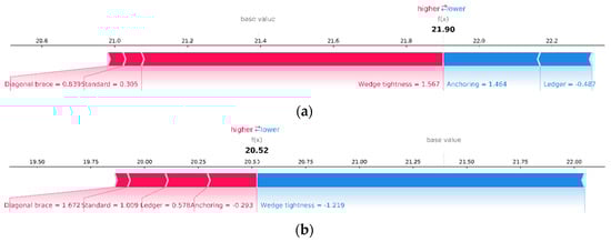 The corresponding working condition in Figure 12b is “the second layer (11.43 m) anchoring missing, 20% wedge tightness, standard wall thickness 2.90 mm, ledger wall thickness 2.51 mm, diagonal brace wall thickness 2.60 mm”. The influence of wall thickness on the hand jack and base jack is small and not listed in the figure. Combined with Figure 11, the large negative SHAP value corresponding to wedge tightness (20%) is the main reason for the decrease in the buckling characteristic value of the bracket. Larger standard wall thickness (2.90 mm), ledger wall thickness (2.51 mm), diagonal brace wall thickness (2.51 mm), and the second layer (11.43 m) wall parts are missing, then the average value corresponds to a positive SHAP value, which is conducive to the improvement of the stability of the bracket. Finally, the predicted buckling characteristic value is 20.52, which is less than the average output value of 21.393.