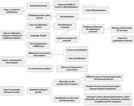 In the second stage of the methodology, the first publication exclusion criteria were applied based on language, type and year of publications. Subsequently, publications that appeared more than once were also excluded. Only the studies published as articles and in the English language were accepted. The year of publication was considered irrelevant to assess the evolution of the number of publications over the years. Once this was done, 44 publications were removed. After analysing duplicates, another 55 publications were removed. Then, based on the topic of the publication, evaluated by reading the abstract or, in some cases, the complete document, another 54 publications were excluded because they did not effectively fit into the analysis of thermal mortars with the incorporation of wastes. Therefore, 51 publications were selected to be analysed in this review.