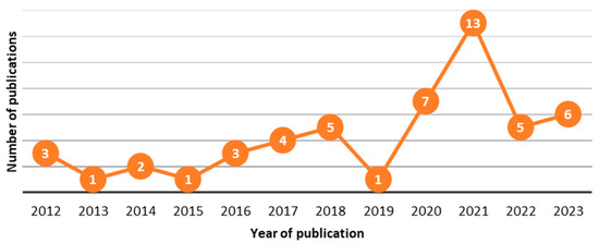 Figure 2 shows the number of publications per year since 2012, the year of the oldest publication among the 51 that were selected, until June 2023, when the data collection for this literature review ended. Although there was no linear evolution in the number of publications, there was a growing trend over the years, except in 2019 and 2022, with 2021 being the year with the highest number of works published on this topic.
