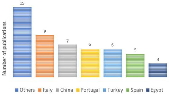 For this analysis, each publication was related to the origin country of the article’s first author, to make a total of 16 countries. According to Figure 3, six countries presented three or more publications on this topic. Italy was the country with highest number of published studies (nine articles), followed by China, with seven publications. From Portugal and Turkey, six publications each were found, followed by Spain, with five, and Egypt, with three. Furthermore, five countries presented two publications each (Brazil, Canada, France, Sri Lanka and the United States of America), while in five countries (Chile, Czech Republic, Lithuania, South Korea and Thailand) only one publication each was found.