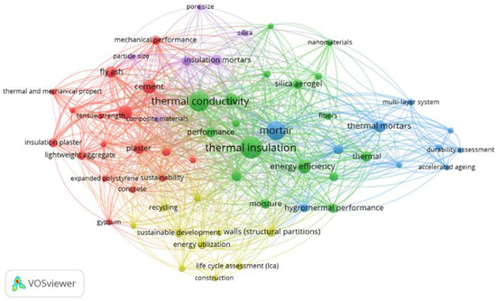 Finally, group 5 presents in purple six items related to commonly used materials and their characteristics, namely “insulation mortars”, “aggregates”, “silica”, “composite materials”, “particle size” and “pore size”. The first two are those with the highest occurrences, equal to 21 and 19, while the total link strength were equal to 132 and 153, respectively.