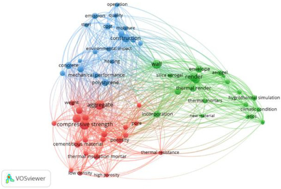 The third cluster contained 19 items in blue. In this group, the most cited term was “construction”, with an occurrence equal to 26 and total link strength of 138. The second most cited word was “polystyrene”, with 22 occurrences and total link strength equal to 109. The items in this group included environmental aspects, in addition to some materials and terms related to the performance of mortars, which included “sustainability”, “emission”, “environmental impact”, “EPS”, “shrinkage”, “heating” and “moisture”.